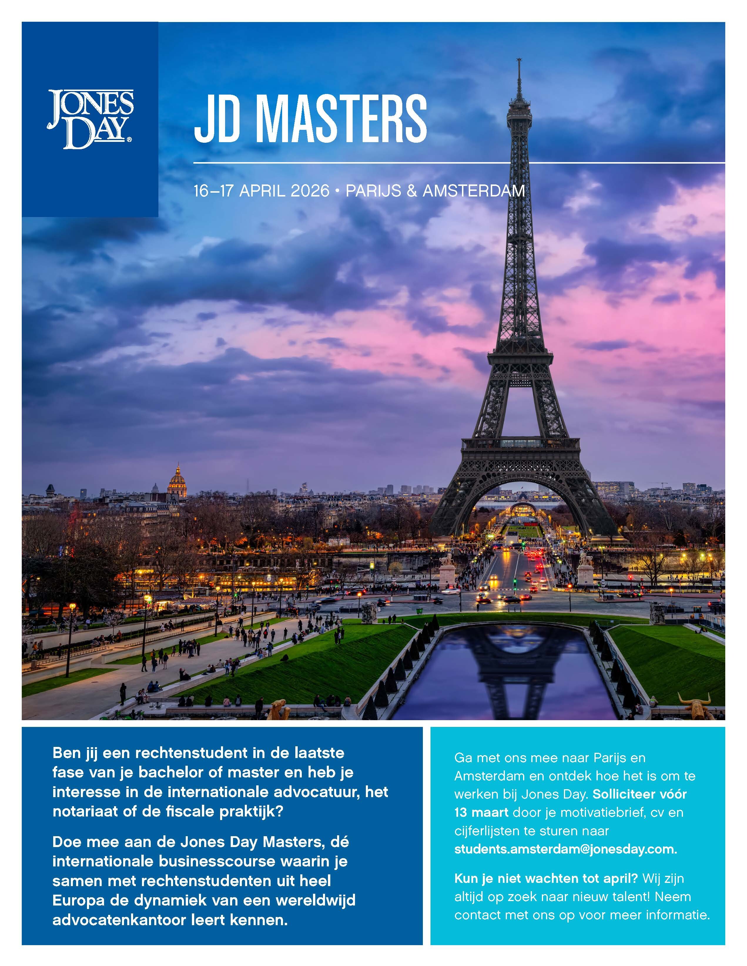 Wil jij weten hoe het is om bij een écht internationaal advocatenkantoor te werken? Neem dan deel aan de JD Masters met rechtenstudenten en advocaten uit Nederland, België, Duitsland, Frankrijk, Italië en Spanje. Tijdens deze tweedaagse masterclass op 16 en 17 april 2026 reis je de eerste dag met ons af naar Parijs om daar te werken aan de beste deal voor jouw cliënt! Nadat jij samen met collega’s uit heel Europa de deal tot een mooi einde hebt gebracht, reis je op de tweede dag terug naar Amsterdam. Hier krijg je de kans om onze advocaten in Amsterdam beter te leren kennen en zal je meedoen aan een kort geding voor een 'rechtbank' van ervaren litigators van ons kantoor.